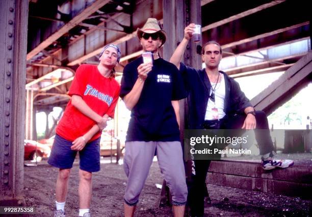 Portrait of the band Primus, left to right, Tim Alexander, Les Claypool, and Larry LaLonde in Chicago, Illinois, August 12, 1991. (Photo by Paul Natkin/Getty Images)